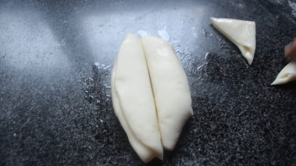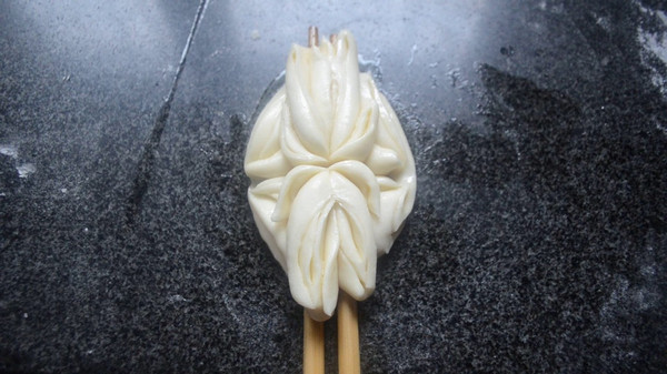 两只手各拿一根抹油后的筷子,竖压在两边,用力下压到底