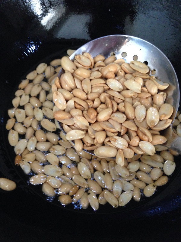 冷油下花生,中小火加热过程中要不时的搅拌,防止花生沾锅的地方糊