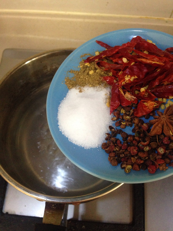 花椒,麻椒,干辣椒剪碎,盐,五香粉,八角,准备好备用