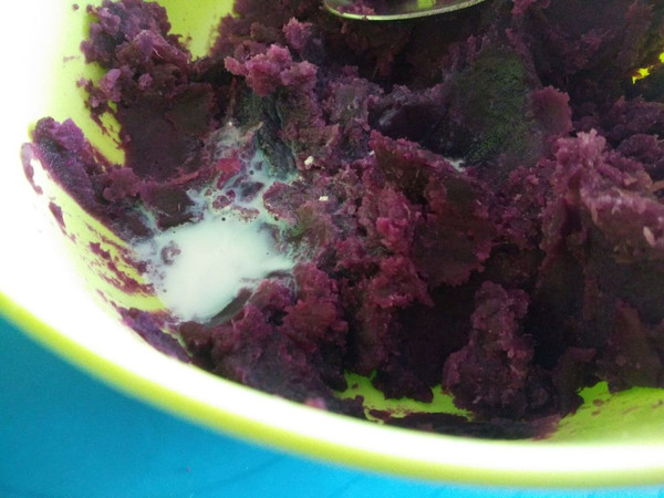 紫薯上笼蒸熟后去皮,用勺子压成泥,加脱脂牛奶,让紫薯馅儿湿润可口,增添奶香。
