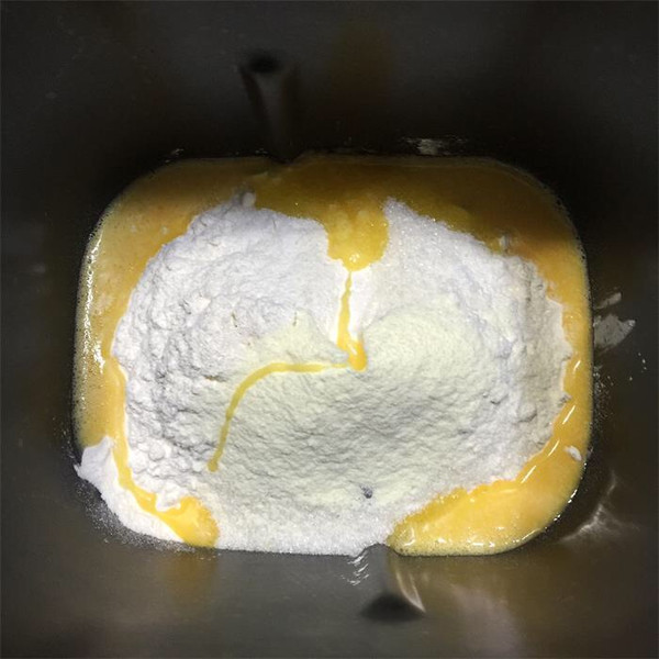 将配料表中A部分称入面包机和面桶,打开和面功能边搅拌边加入称好重量的B牛奶。牛奶要根据面粉的吸水程度来调节,给出的数据仅作为参考。