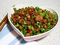 豆角成熟之后 加入之前超好的肉沫 加适量的盐 翻炒均匀