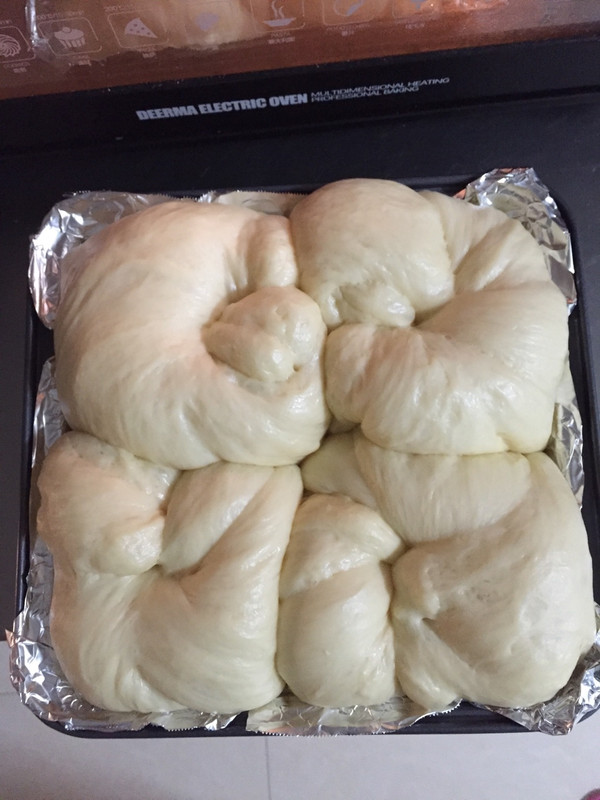 这是整形好的样子,4个面团整形完毕后,放入8寸方形模具,入烤箱,进行二发,大概30分钟,在烤箱里放一碗热水,可以增加湿润度。