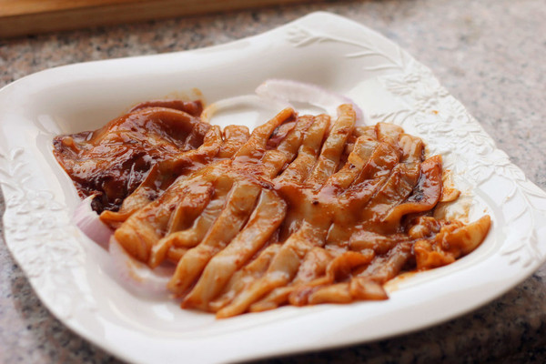 将腌制好的鱿鱼放在洋葱圈上