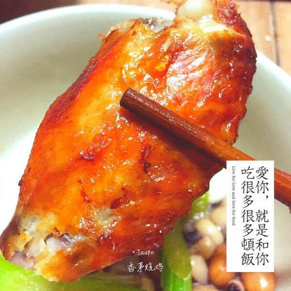 把鸡放在一个烤盘上,腌料也倒进去。先烤里面,胸腔朝上,盖上锡纸封好,放进烤箱中层,175度烤约45-60分钟。(烤的时间也需要跟鸡的大小作出调整)。这一步要把鸡烤熟。因为盖了锡纸,鸡会在里面焖熟,香茅的香气也会更好地渗透进鸡肉里。