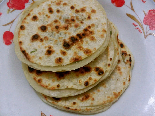 饺子皮平铺,轻轻抹一层植物油撒一点点盐,再放葱花,整完再放下一张饺子皮,如上重复即可,偶用了五张饺子皮,当然数量也可以依个人增加