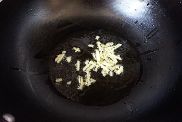 油烧至六成热下姜丝爆出香味儿。