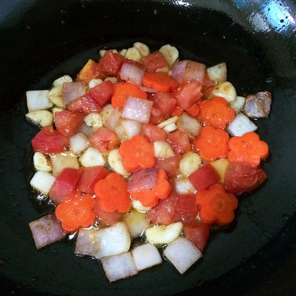 将彩椒切成小丁,蒜籽切成片,胡萝卜用模具切成花。