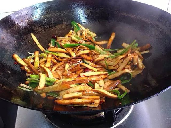 再放入切好的豆腐干子丝儿,炒大约两三分钟