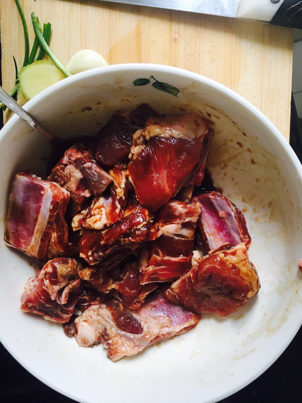 将排骨洗净,按照上述的2勺料酒1勺酱油小半勺盐进行腌制。腌制时间大约1个小时