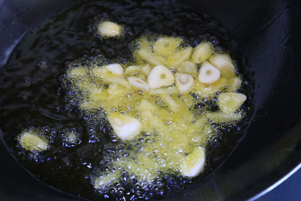 将大蒜切片,生姜切丝入锅爆香。