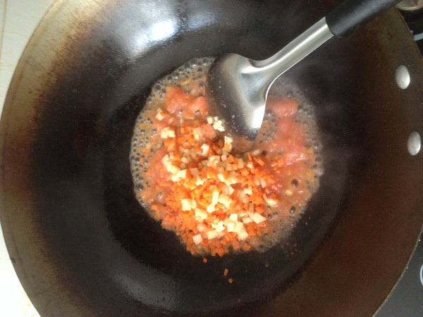 锅中少许橄榄油将西红柿炒软烂加入土豆胡萝卜丁翻炒再加适量水(将材料漫过来)大火煮开转小火