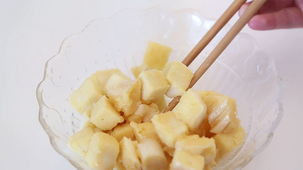 蛋液中加入馒头块和少许宝宝盐调味,搅拌至馒头均匀地裹上蛋液。