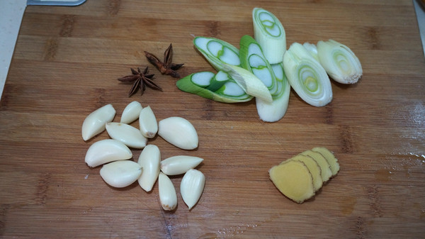 将葱姜蒜放在锅中鱼身两侧,用油煎出香味后,倒入料酒和酱油