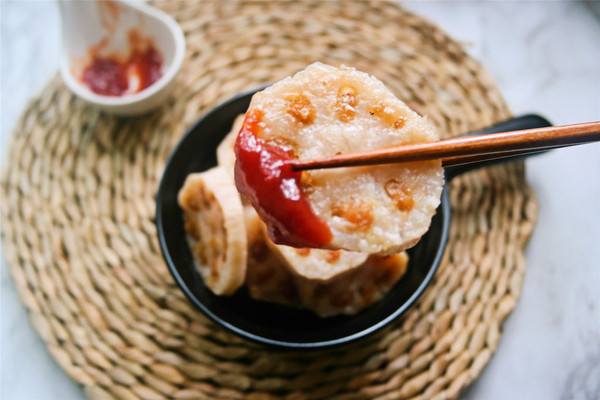 取出,将莲藕(塞肉糜的一面朝下)放入有热油的盘中