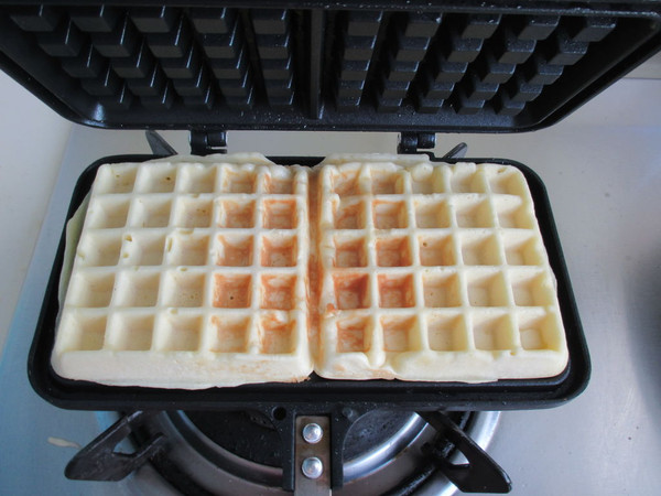 华夫饼模具刷上一层融化的黄油,然后加热,保持中小火,两面都要进行预热,约每一面1分钟左右,从中央倒入面糊