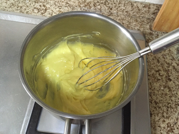 发酵期间可以做一下馅料,这次做的是卡仕达馅。蛋黄牛奶细砂糖玉米淀粉混合均匀,我还加入了吉士粉,没有的话可以不加。