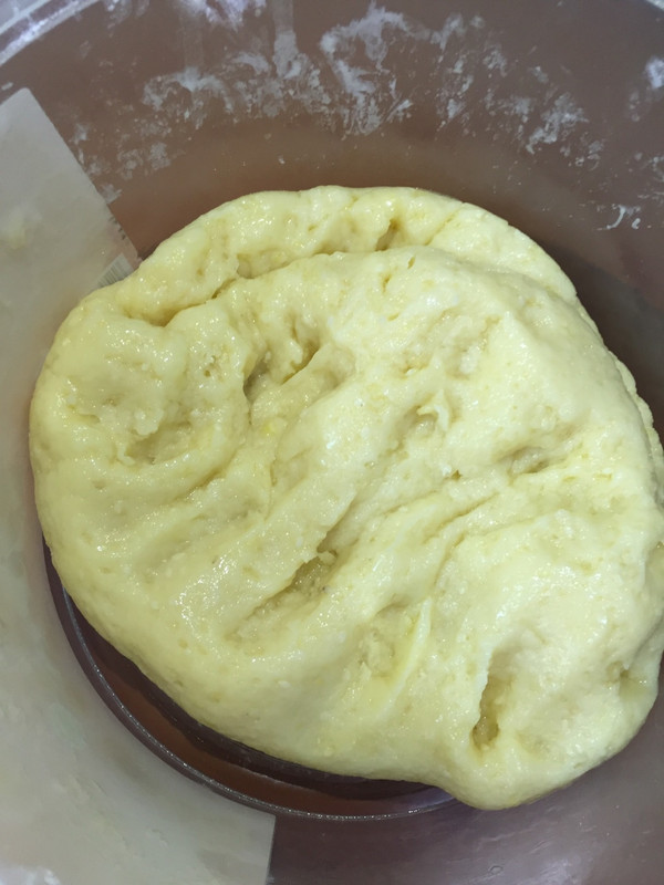 融化的黄油倒入面团中,揉面融入面团