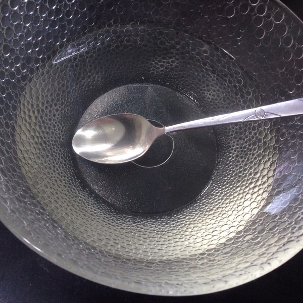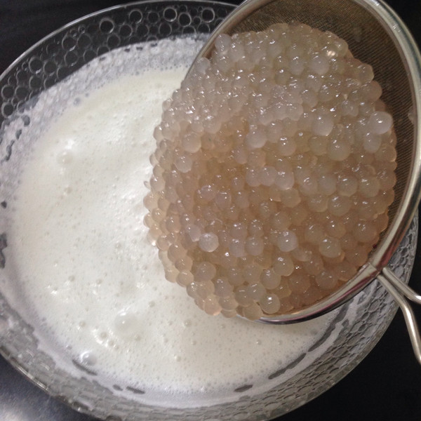 倒入凉开水中,用勺子搅拌,这步是在洗西米哦!(还记得前面步骤西米不能洗,是直接倒入开水中煮的!)洗净后沥干水,再换凉开水再洗一遍,再沥干水分。洗完后的西米不再黏糊糊了,颗颗分明!