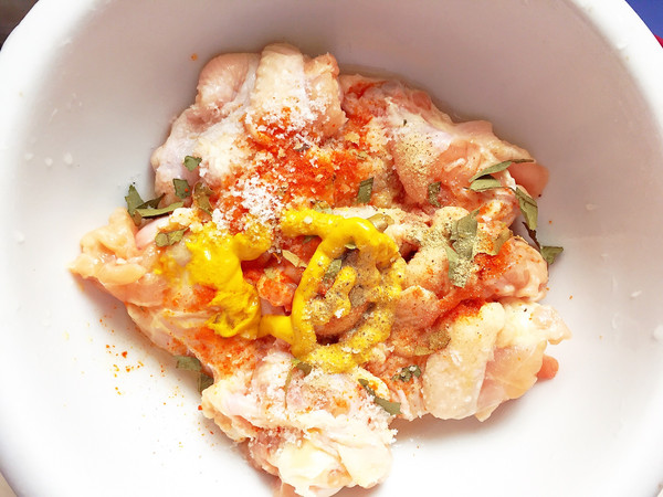 鸡翅洗净,青柠汁挤出,月桂叶碾碎,加入1勺芥末(我用的黄芥末,绿芥末也可以,无所谓)辣椒粉、盐、胡椒