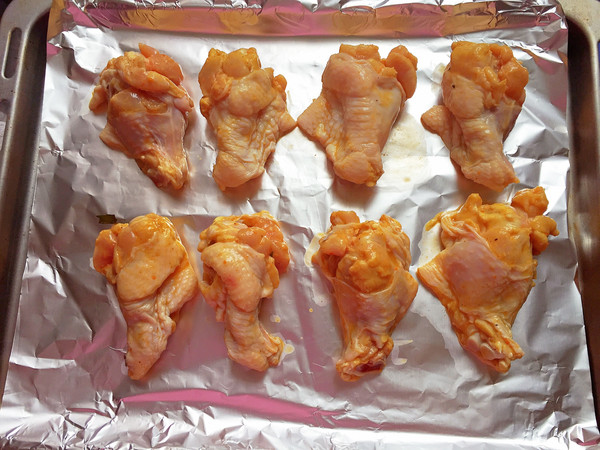 将鸡翅从冰箱里取出,预热烤箱170度,烤盘上铺上锡纸,鸡翅滤干以后铺在烤盘上,酱汁保留备用,放入烤箱烘烤20分钟(也可以在平底锅中用橄榄油煎鸡翅)