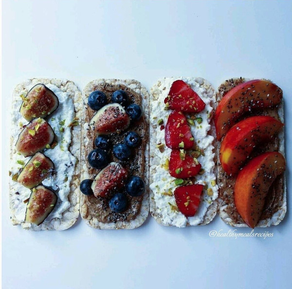 米饼、奶油或花生酱涂抹、蓝莓、无花果、小西红柿、草莓