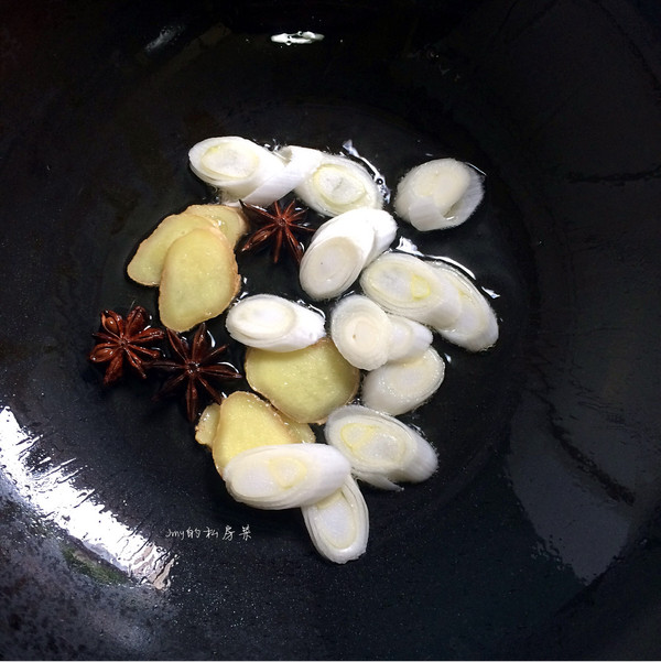 锅子烧热后放油,油温五成热的时候,放入姜片,八角与葱片爆香。