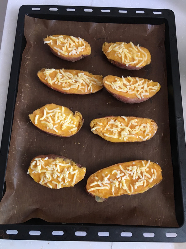 挖出的红薯肉放入碗中,加入白糖、黄油和芝士,趁热用勺子按压成泥。