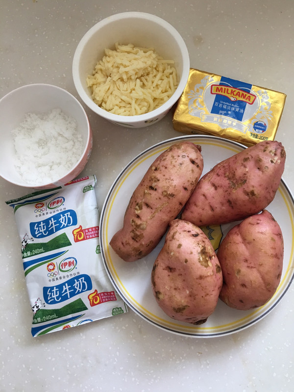 再倒入适量的牛奶调制一下,搅拌成厚厚的的泥状。(红薯比较干加入牛奶调制,口感会更好)