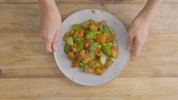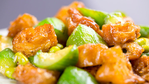 放入老油条碎翻炒几下,一道丝瓜毛豆炒老油条就做好了。