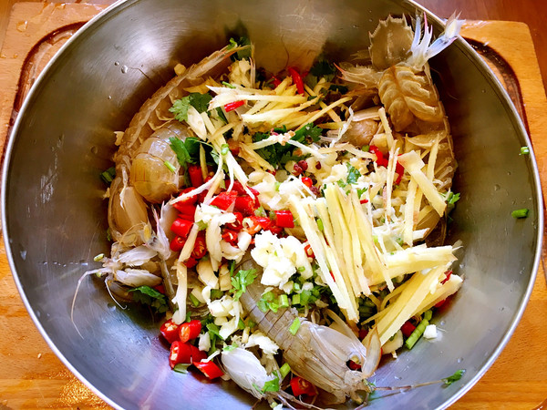 海鲜生活在高浓度的盐水里,活体很干净,辣椒姜蒜都具有高强度的杀菌保鲜作用。把腌料切碎