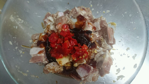 放料酒,白胡椒粉,盐,糖,抓匀,保鲜膜包好,进冰箱冷藏腌制1-3小时。去腥和入底味。图为腌制3小时候后的排骨。