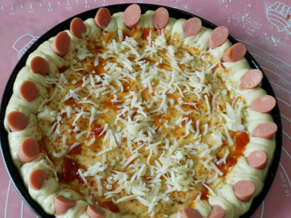 开烤箱200度预热5分钟。在围边上刷上鸡蛋液,用叉子在底部叉出无数小孔,刷上一层披萨酱。