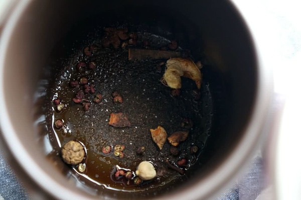 在洗干净的炖盅里放入八角、桂皮、干姜、花椒、茶包、盐和酱油;