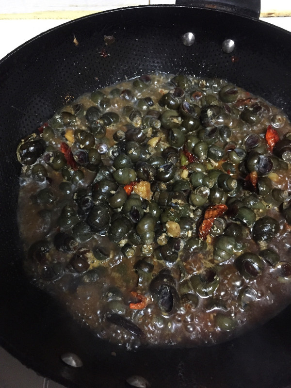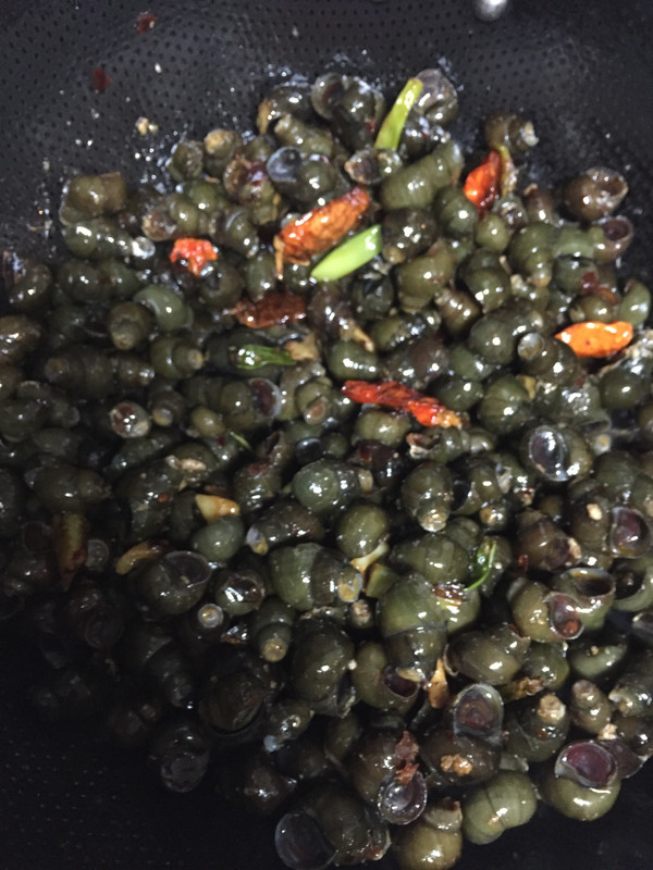 放入田螺翻炒两三分钟,淋入白酒,立即盖上锅盖,让田螺吸收酒香。