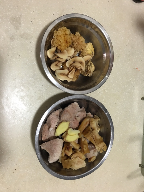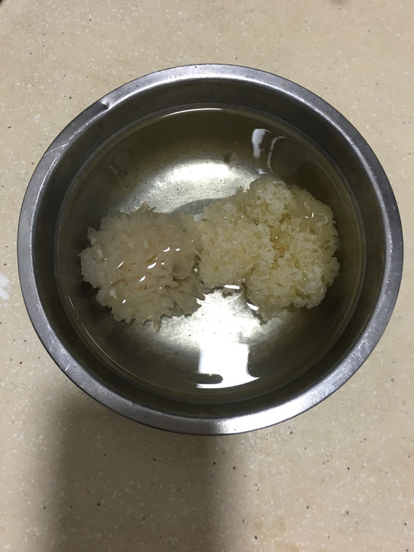 1个半小时后加入泡好的雪耳,继续小火煲半小时
