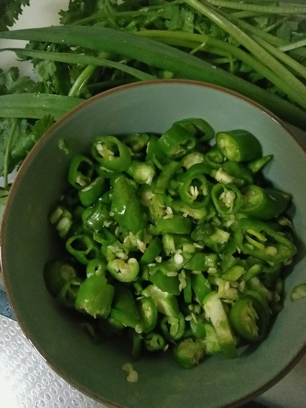 辣椒切圈,大的切碎。最好带上手套,或者把手用保鲜膜包好,你懂的辣椒水粘手上的感觉