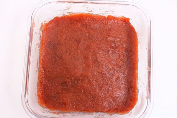 将煮好的山楂酱盛入保鲜盒内,自然晾凉后放的冰箱里冷藏至定型。