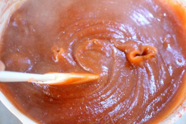熬到勺子上的泥状侧立起来倒不出来了,表面开始结晶,这就差不多好了,可以放入模具中。