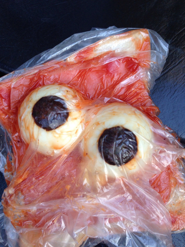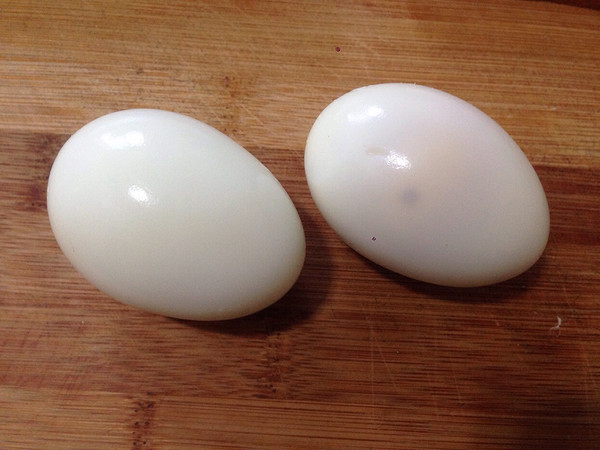 将鸡蛋切成两半,放在火腿上。将海苔剪成圆形贴在鸡蛋上。