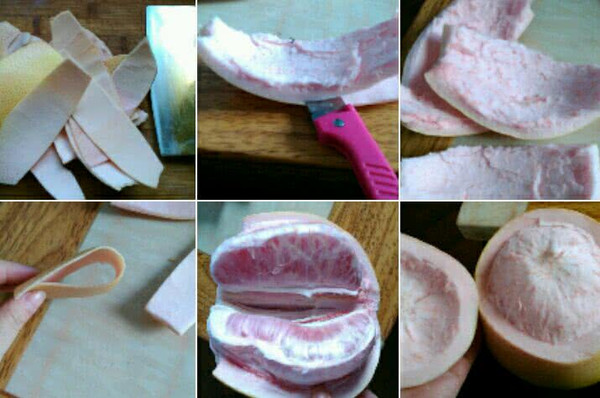 柚子打开,把皮洗干净然后把皮上的白色部分削掉。