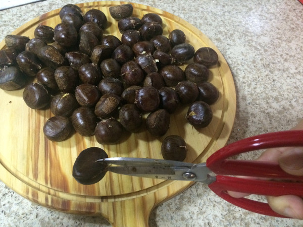 一手捏住板栗底部,一手拿剪刀在每个板栗尖头处,剪十字口,注意安全!