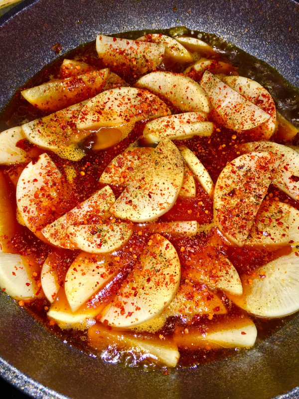 白萝卜切8毫米左右厚片,坐锅烧热注入菜籽油烧辣给红油豆瓣酱给白萝卜翻炒半15秒注入高汤给老抽,生抽,白胡椒粉,麻辣底料,花椒粉,辣椒粉,盐,白糖,煮沸小火闷煮15分钟!