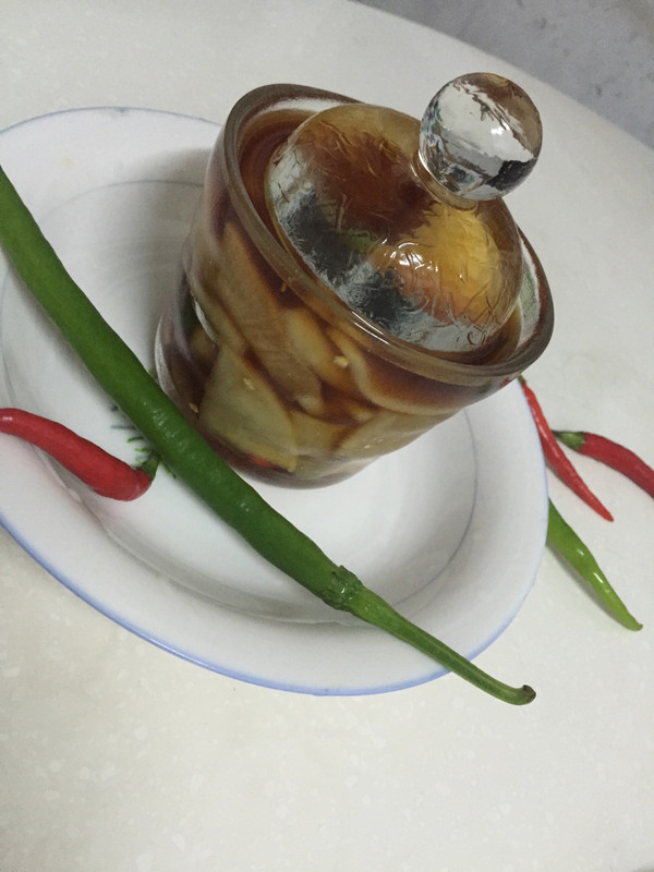 沥干的萝卜放入干净玻璃瓶,放入糖、醋、切好的辣椒,姜丝、蒜片,拌匀!放入冰箱二三天。(根据多少来确定自己时间)