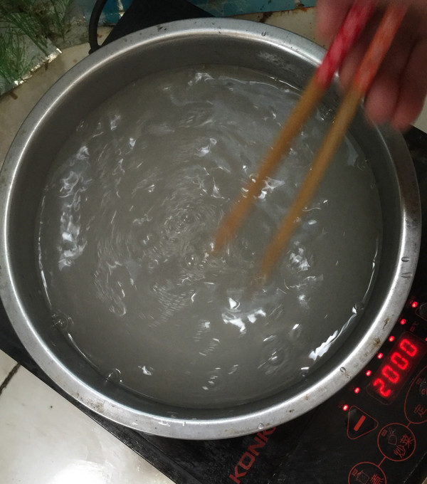将50克白凉粉倒在盆子里,加入100克凉开水搅拌成均匀无核的糊状!