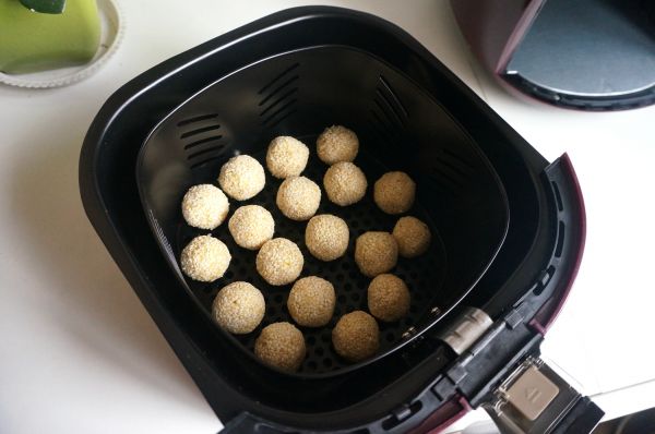 将红薯芝麻球码放进空气炸锅的炸篮内