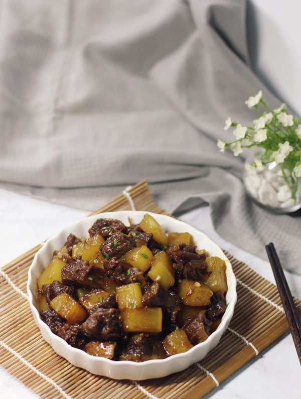 筷子比较容易可以插入肉块时,放入备用的萝卜块,继续小火煮至萝卜软糯。