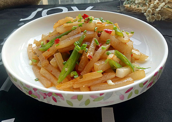 盖上锅盖,小火焖至白萝卜条微透明,水份收干,加入青椒翻炒,出锅,撒些香葱