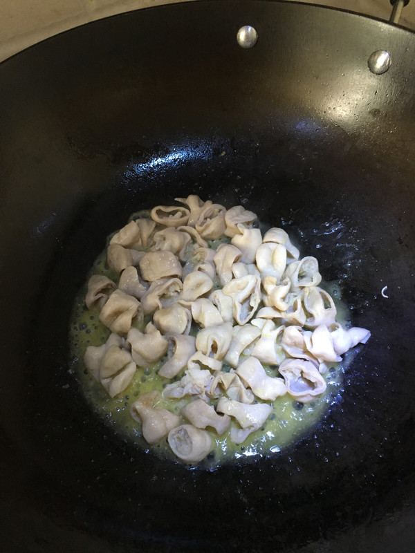 大肠洗净焯水,入油锅煸炒,炒干水份,逼出肠油。