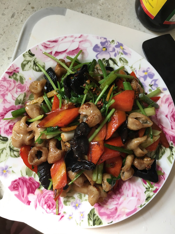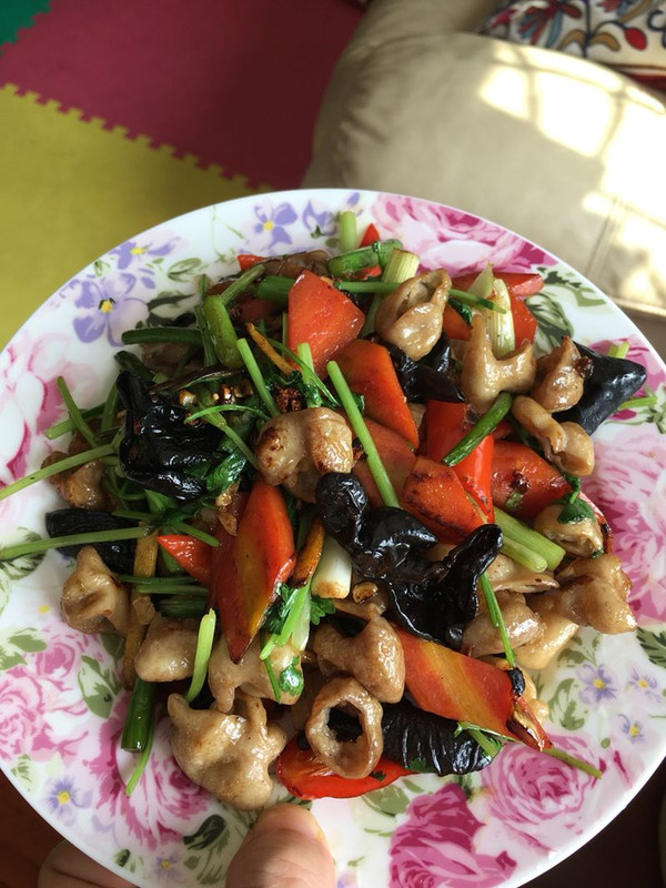 加入蒜苗,胡萝卜,然后木耳,红椒。